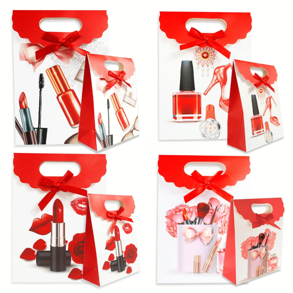 Kit com 12 Sacolas de Papel para presente com Velcro Modelo Maquiagem 12x16 cm