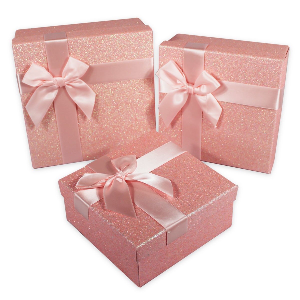 Kit com 3 Caixas de Presente Rosa com Glitter e Laço Decorativo – Um Toque de Elegância para Presentes Inesquecíveis!