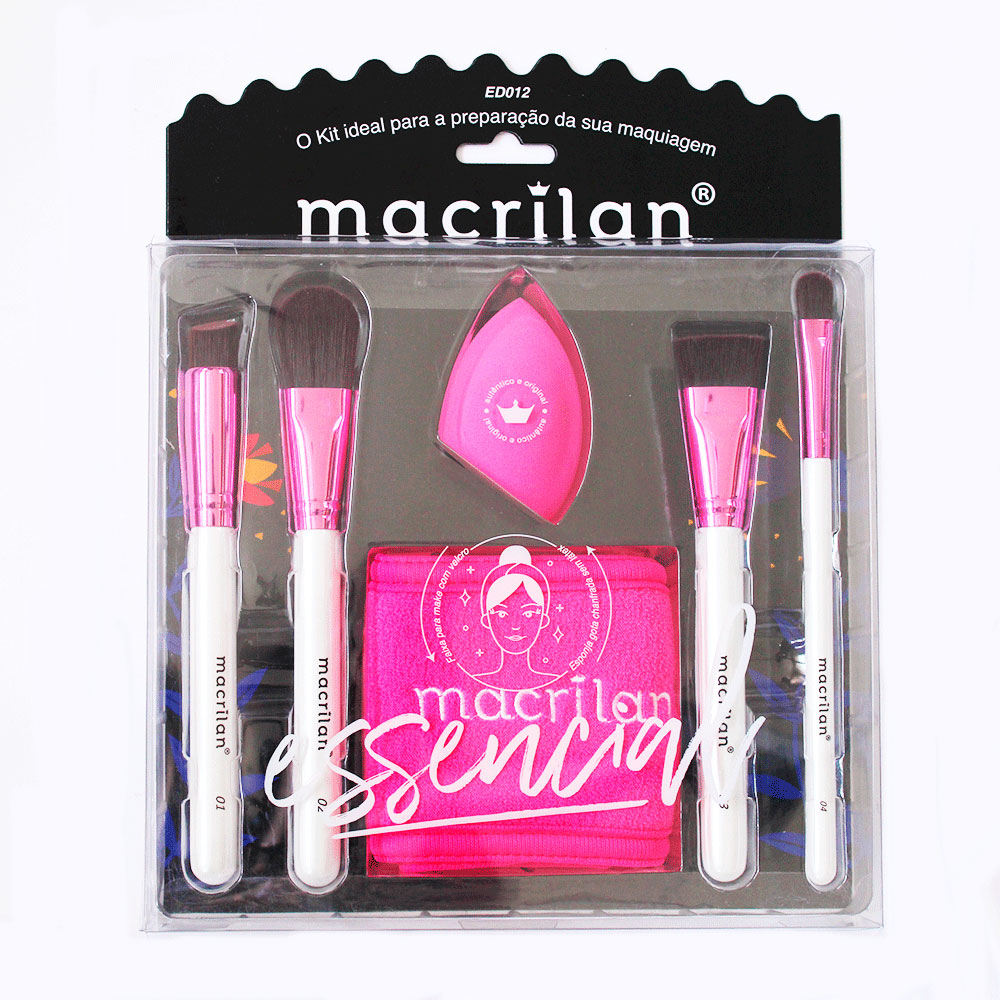 O Kit ED012 Essencial da Macrilan, foi especialmente desenvolvido com 04 pincéis de cerdas sintéticas, 1 faixa de cabelo e 1 esponja super macia, sem látex, em formato de gota chanfrada. Os pincéis possuem cerdas e formatos que permitem um acabamento suave e impecável, além do cabo moderno e de fácil manuseio. O Kit essencial para a preparação da sua maquiagem.